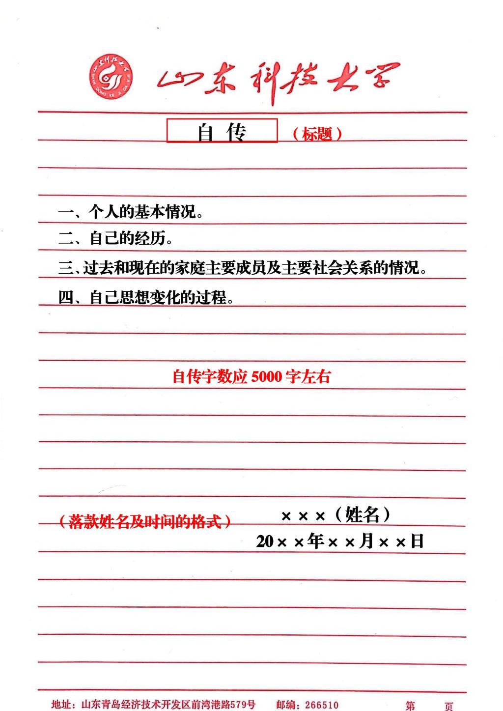 自传书写格式及要求:
