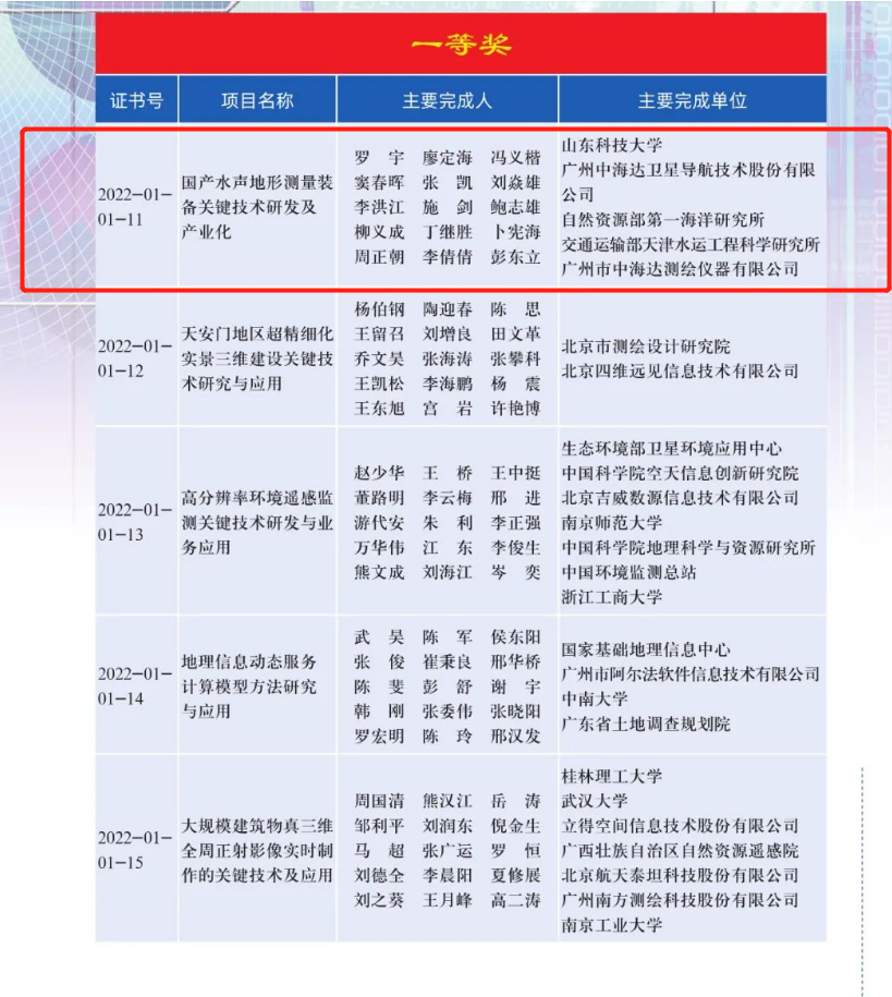 罗宇教授主持,与广州中海达卫星导航技术股份有限公司、自然资源部第一海洋所、交通运输部天津水运工程科学研究所和广州市中海达测绘仪器有限公司共同完成的“国产水声地形测量装备关键技术研发及产业化”项目获得中国测绘科学技术奖一等奖。