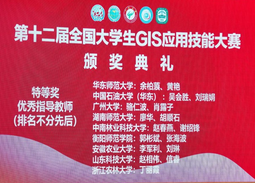派出的比赛代表队经过层层筛选和激烈角逐,获得特等奖,赵相伟老师、信睿老师获评优秀指导教师,代表队成员是来自2021级地理信息科学专业的张恒瑞、张光泽、张成茁和钟亚妮四位同学。