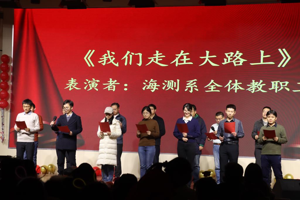 晚会伊始,测绘系带来了合唱曲目《歌唱祖国》,用歌声传递了对祖国的热爱;接下来是教工子女演唱《有你就幸福》、研究生带来的歌曲串烧和幽默风趣的配音秀,昔日的经典台词搭配上研究生会学术部诙谐的语言,赢得了全场观众的阵阵欢笑与掌声。第二篇章以海测系合唱曲目《我们走在大路上》拉开帷幕,《麻辣甜心》、《小花朵》等节目展现了萌娃们的超强的舞蹈实力。第三篇章中,学院全体辅导员带来了令人耳目一新的表演《科目三+手势舞》,瞬间将现场气氛燃爆。随后高春春老师表演了脱口秀《望闻问切》,宿贝尔表演了舞蹈《唱花儿的花儿》,他们的演绎赢得了全场喝彩。第四篇章在机关女教职工的合唱歌曲《365里路》中激情唱响。紧接着,一场幽默诙谐的集体朗诵《我爱科研》为观众奉上。压轴出场的是地信系教职工的《诗韵流觞看今朝》,演员们通过婉转悠扬的声音,将经典诗词娓娓道来,为观众奉上一场美轮美奂的诗歌朗诵和音乐盛宴。