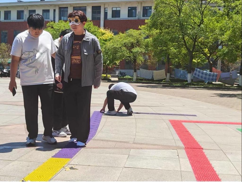 活动现场,同学们热情参与,积极探索盲人世界。此次活动共分为三个环节,在“知识科普”环节,志愿者们细致讲解了有关视障人士的基本知识,包括日常生活中的常见障碍、辅助工具的使用以及社会对他们的支持措施等,同学们认真聆听,并积极提问,对视障人士的生活有了更深入的了解;“盲猜物品”环节中,工作人员为同学们戴上眼罩,将他们带入一片漆黑的世界。同学们通过触觉来辨认手中物品,切身感受盲人日常生活的困难;“模拟马路场景”环节则更具挑战性,志愿者们在“盲道”上设置了障碍,让同学们戴着眼罩体验盲人行走,同学们在摸索中跌跌撞撞,体会到盲人出行的不易和对环境的依赖,这一环节让同学们深刻认识到,残障人士需要社会各界给予更多的关爱和帮助。