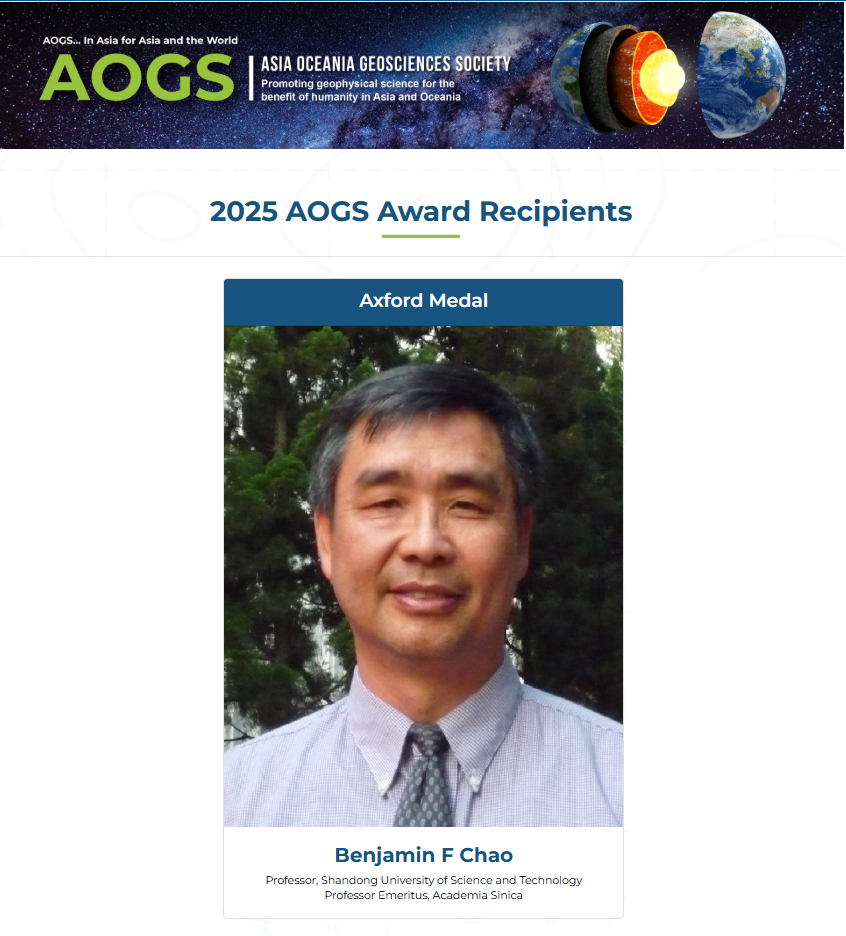 赵丰教授长期致力于空间大地测量学及地球动力学研究,是国际著名大地测量学家和地球物理学家。他先后当选国际大地测量学会IAG会士、美国地球物理联合会AGU会士,对全球大地测量学与地球动力学做出了卓越贡献,其研究成果多次在国际顶级学术期刊Science和Nature发表。赵丰教授积极参与并推动AOGS的发展,于2016-2018年担任AOGS主席,为促进亚洲国家和地区的科学与合作做出了卓越贡献。