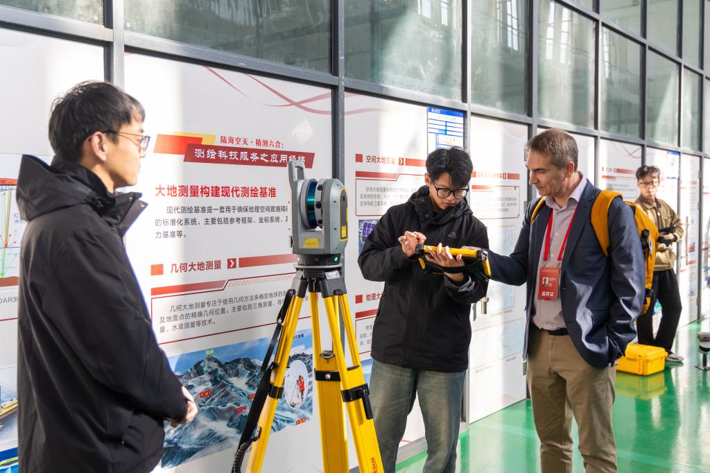 副院长刘尚国从科普推广、专业建设与人才培养三个方面介绍了实验室发展概况,重点展示了元宇宙智能测绘装备、无人机测绘和无人船测量系统、自主研发的海洋探测设备、北斗定位系统等先进技术平台。参观过程中,外宾表现出浓厚兴趣,并与技术人员进行了现场交流。
