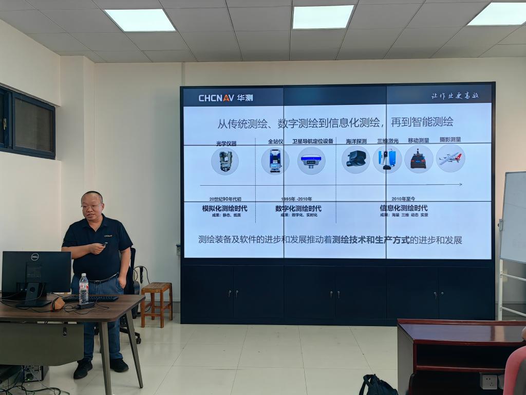 胡炜讲解了从模拟测绘到数字测绘、信息测绘再到智能测绘的发展过程,并从RTK测量系统、激光雷达系统、无人机测绘系统、无人船测量系统、监测集成系统、农机导航自动驾驶系统、数字施工管理系统、组合导航系统等方面对当前测绘作业中的智能装备进行了详细介绍。在报告过程中,胡炜将讲解与图像、视频等多种方式结合,为与会师生展示各种智能装备的作业原理、作业流程,整场报告生动形象,引人入胜。会后,胡炜与参会学生进行了现场交流,对大家的提问做出了详细解答。