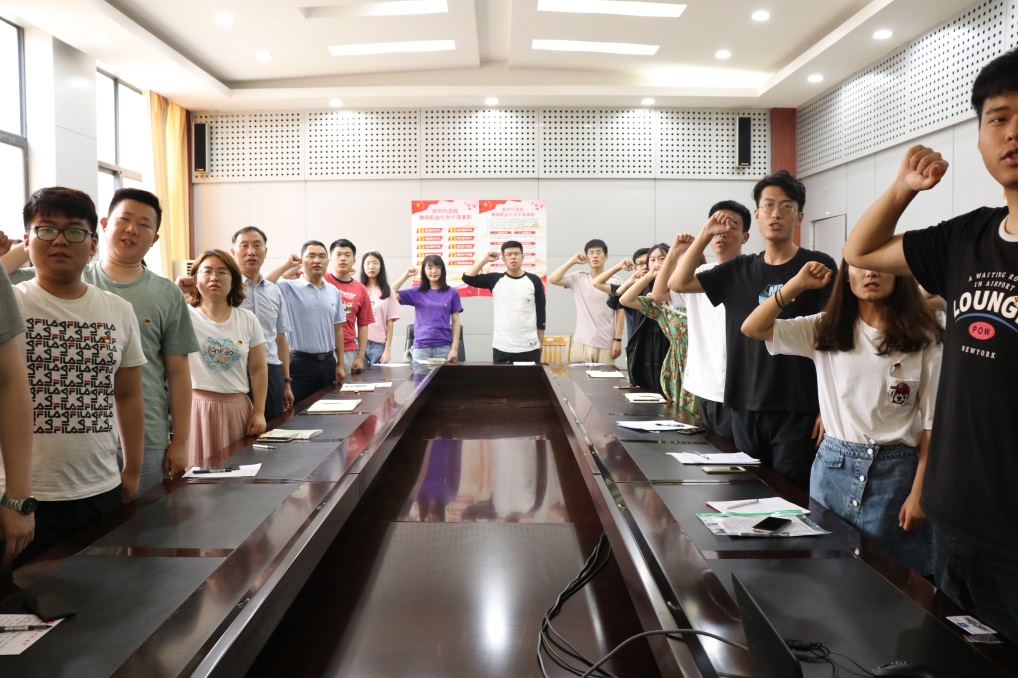 会议结束后,本科生第一党支部书记孙老师带领参会全体党员面对党旗,重温入党誓词,希望他们不忘初心,砥砺前行。