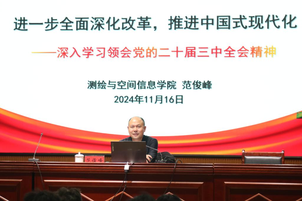 党委书记范俊峰为测绘、地科学院第34期入党积极分子作“进一步全面深化改革,推进中国式现代化——深入学习领会党的二十届三中全会精神”专题辅导报告。