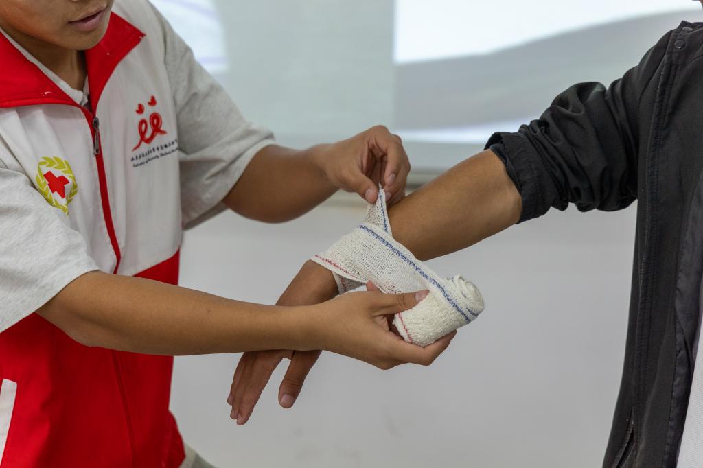 红十字会应急救护与安全避险宣讲团进行宣讲,主要围绕血压测量、常见意外应对措施、心肺复苏与包扎止血四个方面进行。宣讲人员详细演示了心肺复苏的操作流程及体外除颤仪的使用,并创新性地结合音乐《最炫民族风》,帮助同学们更直观地感受胸外按压的频率和节奏。最后,在包扎止血讲解环节,宣讲人员演示了针对胸部、肩部、手部及头部的基本包扎止血方法,并邀请同学们担任模特参与演示。活动中,同学们积极配合,二人一组,踊跃上台练习。