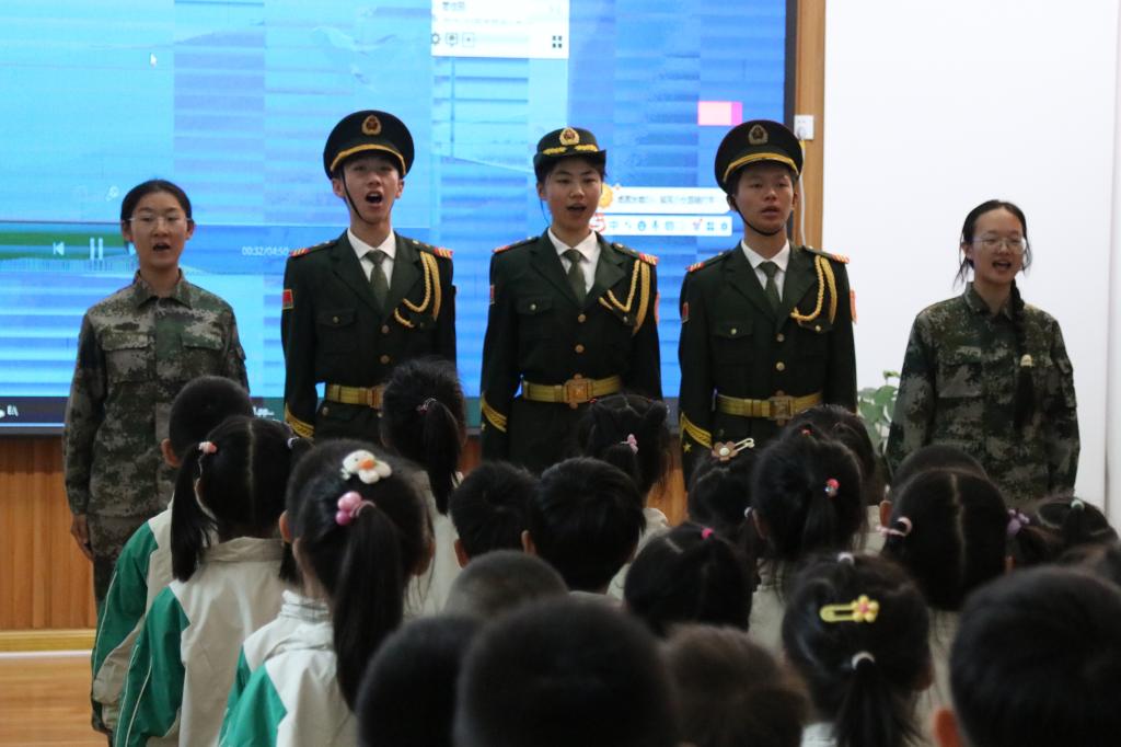 升旗仪式后,队员丁慧为小朋友们带来正步走展示,并耐心地教小朋友们学习正步,赢得了小朋友们的阵阵掌声。随后,队员赵宏宇通过PPT和视频,生动地讲解了第一面国旗的故事,让小朋友们对国旗的历史有了更深的了解。在队员邴秀洁和于姝涵的带领下,小朋友们还学习了手势舞《名字叫中国》,他们挥舞着双手,脸上洋溢着幸福的笑容。全体小朋友和老师们一起合唱国歌,嘹亮的歌声回荡在幼儿园的每一个角落,
