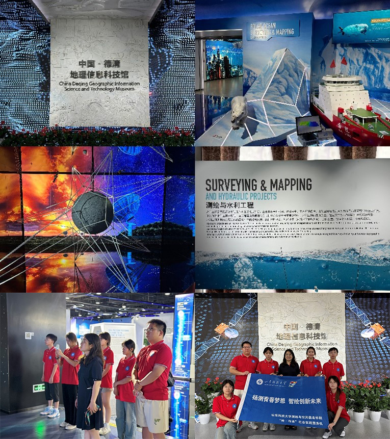 当日下午,实践队一行抵达了第三站——德清地理信息科技馆。跟随讲解员的脚步,实践队参观了导航与位置服务馆、航天航空遥感专馆、导航与位置服务馆等。地理信息科技馆围绕智慧成果可视化,融合人工智能、虚拟现实、全息成像、互动体验等方式,通过科学性、知识性、趣味性相结合的展览,反应测绘科学原理及技术应用,传播并普及地理信息科技知识,展示地理信息产业的发展历程,通过图文展示、科普画廊、音像、互动体验等多种形式和手段展现地理信息事业的发展和成果。生动的展示和详细的解说,让实践队同学们明晰了地理信息的历史发展脉络,也深切领略到了科技的飞速进步给行业带来的巨大变革。“这是一次精彩的地信课堂,在这里我看到了地信发展的精彩历史与美好未来。”实践队员高玲说。