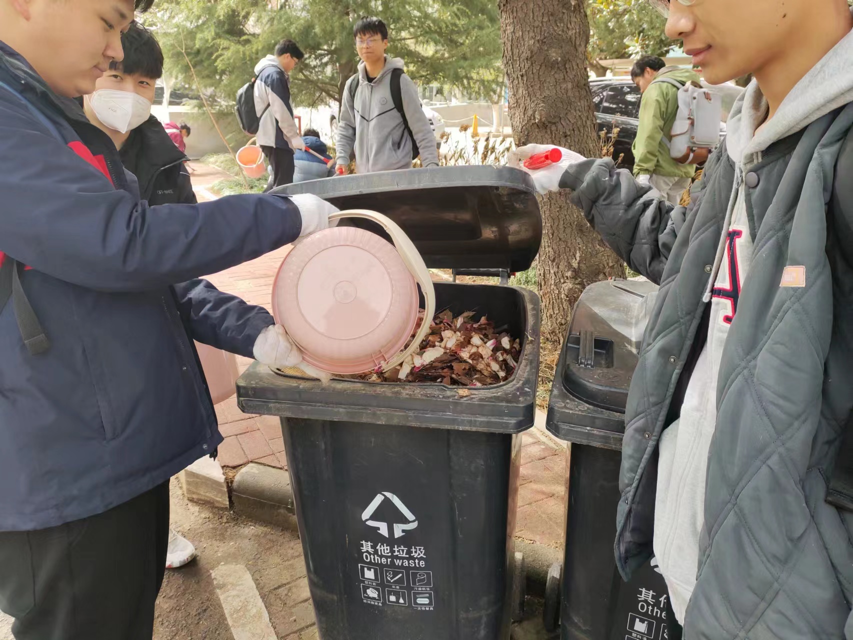 经过简单地任务分配,同学们便手持工具迅速投身清洁工作。伴着阵阵微风,清扫工作井然有序,不一会儿道路、花坛变得一尘不染。手中的垃圾桶变得沉甸甸、鞋上裤脚上也沾上了泥土,可同学们的脸上却多了一份笑容。