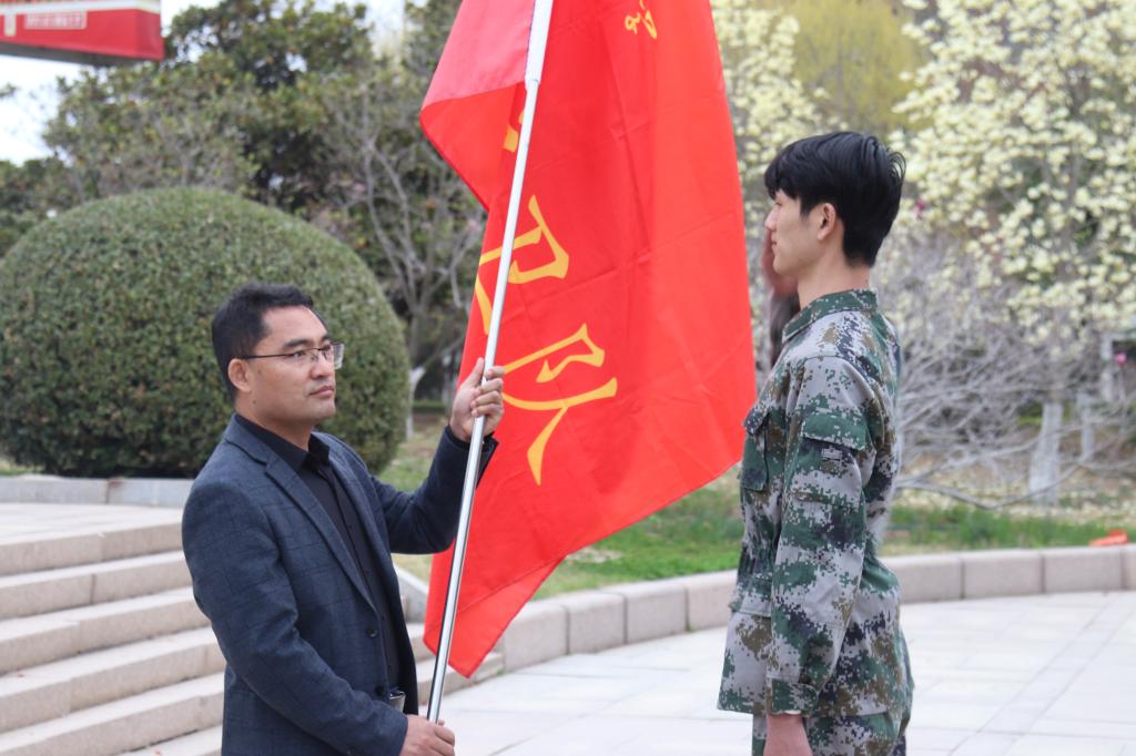 大会上,吴昊为第二十一届国旗护卫队授队旗,勉励新入队的队员们要刻苦训练,再创佳绩!队旗交接仪式后,国旗护卫队队长边桂德带领新老队员们面向国旗庄严宣誓。