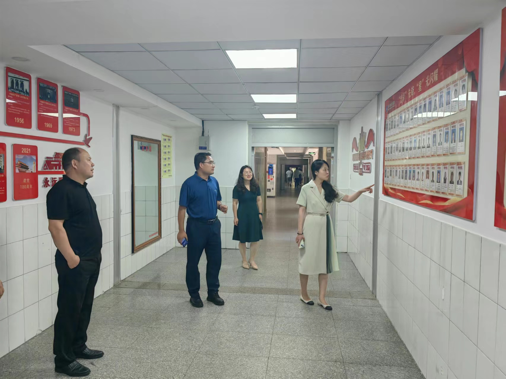 姜媛到学院“绘·青春”一站式学生社区参观指导。她赞扬了学院学生社区建设成果,驻足党建文化长廊,听取了建设理念和思路。她对“绘”系列和科学家精神墙的展示充满兴趣,认为和学科特点结合充分。她在国旗护卫队文化工作室详细了解了队伍的发展历程及学生培养情况,在“寓”党同心辅导员工作室对工作室建设提出建议。