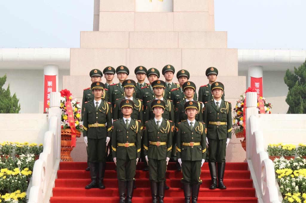 上午8时,仪式正式开始,礼兵就位。伴随着铿锵有力的步伐,国旗护卫队队员身着统一制服,手持礼宾枪,迈着标准正步从陵园入口行进至烈士纪念碑前。队员们身姿挺拔、目光坚定,步伐整齐划一,脚步声在肃静中回响,展现出新时代青年昂扬的精神面貌与对革命先烈的深切缅怀。