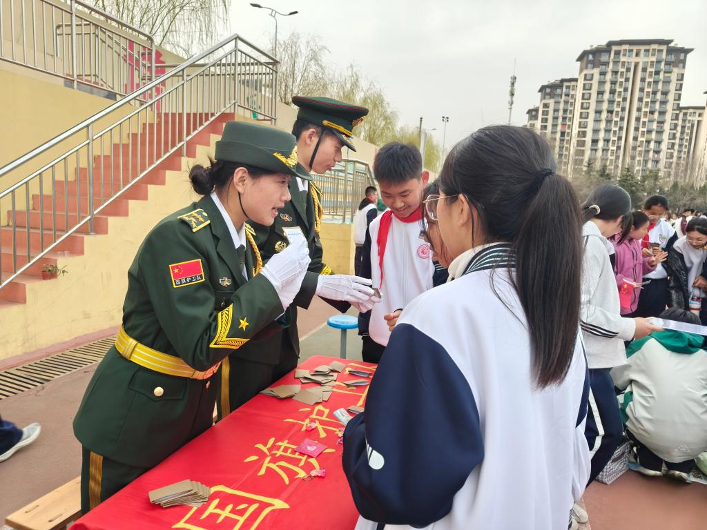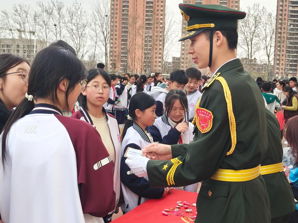 国旗护卫队走进青岛西海岸新区辛安初级中学,在学校举办的义卖活动中开展“学雷锋这样做”主题情景问答活动,以趣味互动的形式让雷锋精神扎根校园。