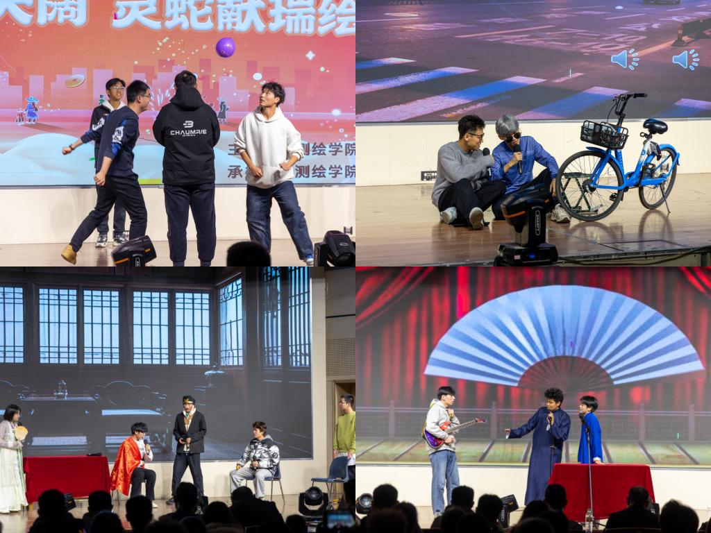 晚会以第一篇章“跃动当燃”活力开启,大艺团器乐队以一曲《想去海边》率先奏响青春旋律,大艺团舞蹈队的《whiplash》搭配地信一班的《青海摇》,用动感的节奏与激情的表演点燃了现场气氛,测绘五班带来的歌曲《罗生门》,也将现场气氛推至高潮。随着中场游戏的欢乐结束,第二篇章“笑靥常开”欢乐呈现,地信二班的《碰瓷》、学科部的《西游记——四圣试禅心》以及新闻工作室的《测绘传奇》,凭借幽默风趣的情节与表演引得观众笑声不断、掌声雷动。