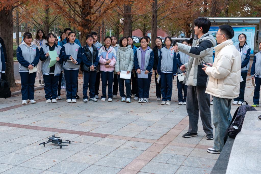 随后,实验中心老师带领同学们参观了标准化测量实验教学场地,对强制对中观测墩、测绘文化彩绘、国家控制点进行了学习了解,并进行了全站仪测距、测角操作体验。在地球科学馆广场,同学们观看了无人机飞行、数据采集及三维建模的全过程,现场气氛十分热烈,赢得了同学们阵阵掌声。