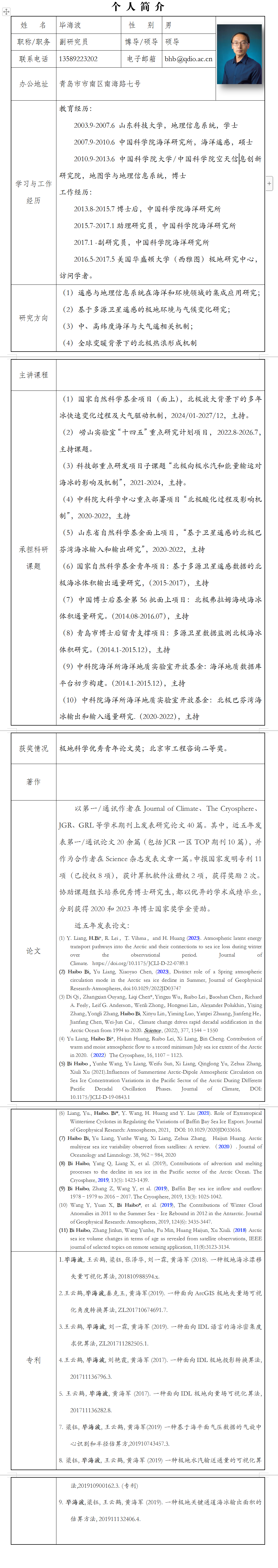 (1)遥感与地理信息系统在海洋和环境领域的集成应用研究;(2)基于多源卫星遥感的极地环境与气候变化研究;(3)中、高纬度海洋与大气遥相关机制;(4)全球变暖背景下的北极热浪形成机制