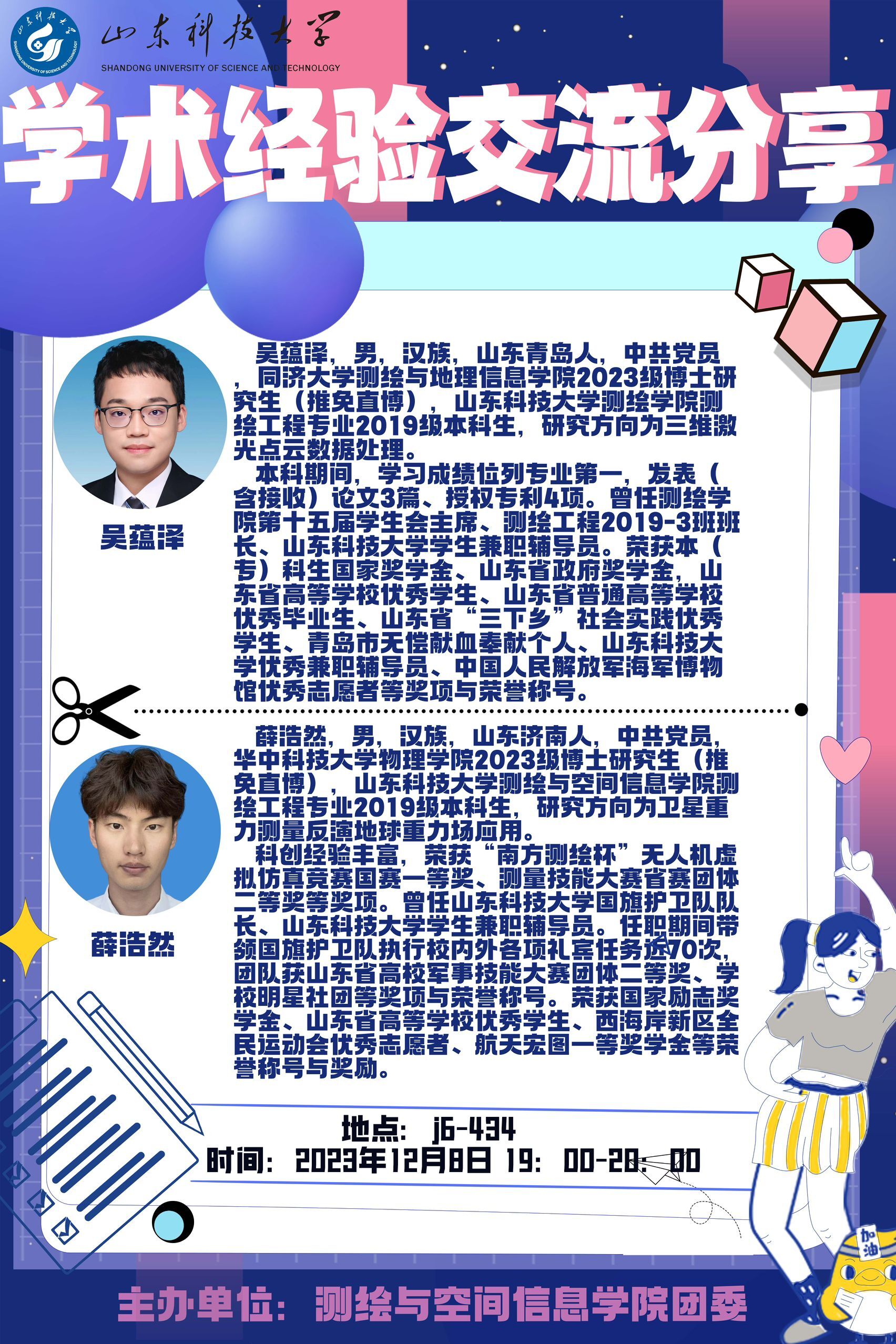 为培养同学们的科研素养,发挥优秀学子榜样引领作用。12月8日晚,色情小说 于J6-434报告厅举办学术经验交流分享会。本次会议邀请色情小说 测绘工程专业2019级毕业生、同济大学色情小说 2023级博士研究生吴蕴泽,测绘工程专业2019级毕业生、华中科技大学物理学院2023级博士研究生薛浩然作为主讲人,向同学们分享经验,并与同学们进行亲切交流。吴蕴泽以“我与嵙大的四年”为题,讲述了他在校期间的学生工作、志愿服务、科研经历,感...