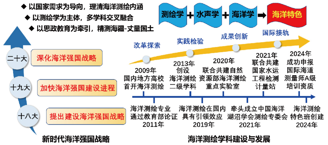 海洋是高质量发展战略要地,随着海上丝绸之路建设和国家利益拓展,深海大洋开发利用成为我国海洋发展战略的重中之 重。我国海洋强国建设蓝图下,海洋测绘向需而生。在国家海洋战略大背景下,面向高水平海洋测绘人才培养需求和海洋测绘技术研究前景,海洋测绘系于2004年成立。