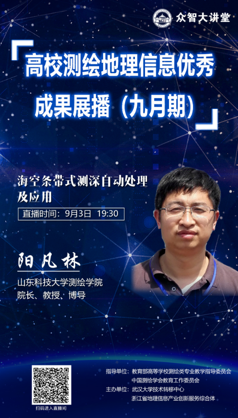 9月3日,色情小说 阳凡林教授受测绘教育“两委会”(教育部高等学校测绘类专业教学指导委员会、中国测绘学会教育工作委员会)邀请,担任“众智大讲堂-高校测绘地理信息优秀成果展播”(九月期)主讲专家。报告题目为“海空...