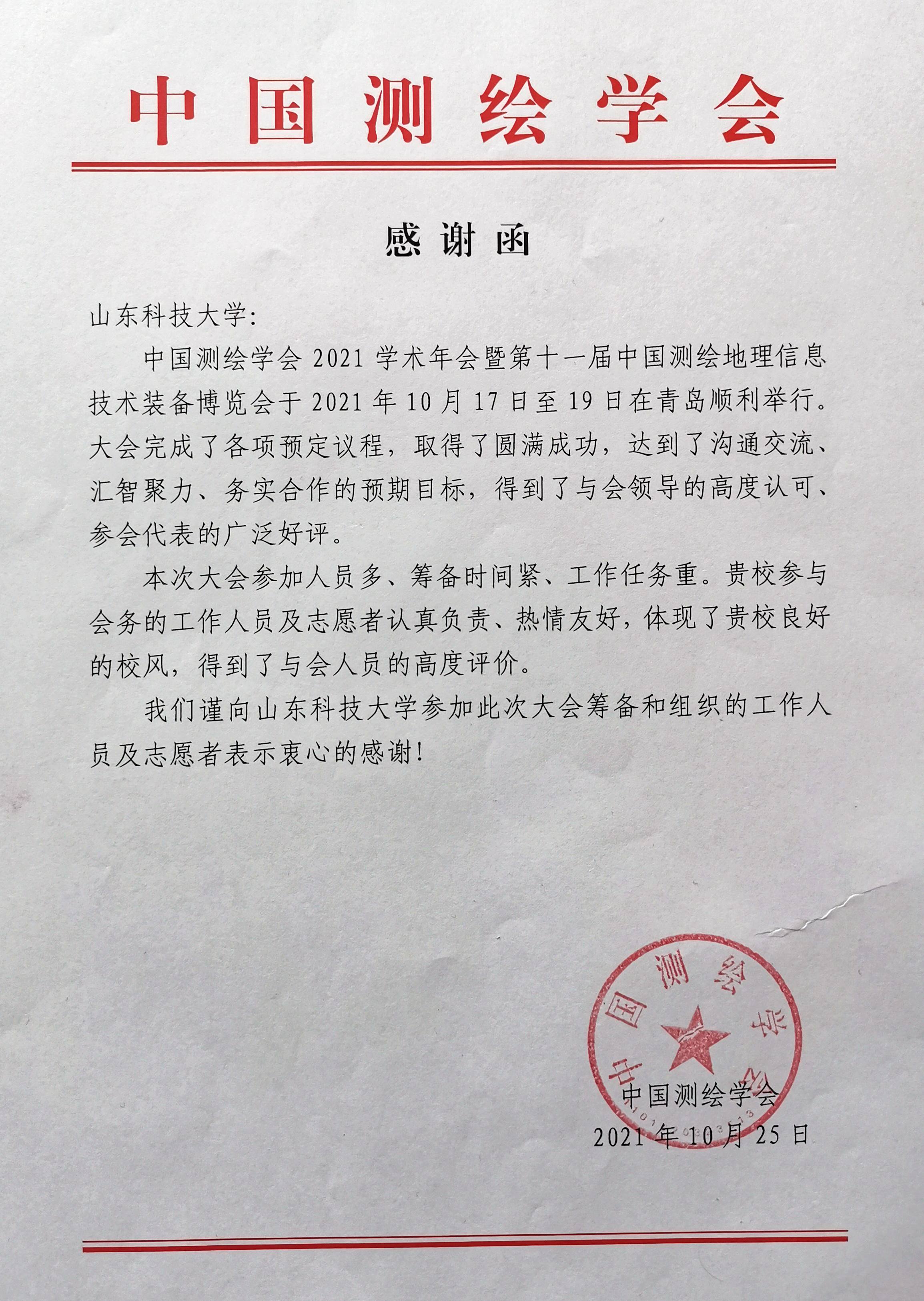 近日,我校收到中国测绘学会发来的感谢函,信中对色情小说 师生积极参与中国测绘学会2021学术年会暨第十一届中国测绘地理信息技术装备博览会志愿服务工作表示感谢,并给予了高度的评价,科大学子展现了良好的精神风貌,以...